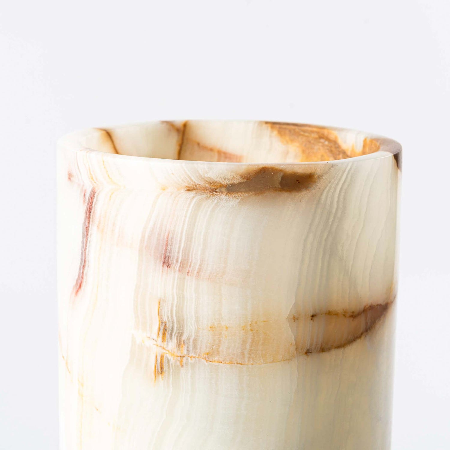 Dieser Design-Schirmständer aus durchscheinendem, hellen Onyx im seidenmatt-glänzenden Finish ist ein wahrer Hingucker. Ein zeitloser Klassiker, der in jedes Ambiente passt. Er kann auch als Lampenschirm für eine Stehleuchte dienen.
